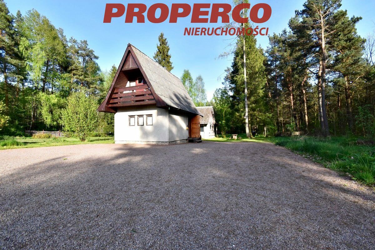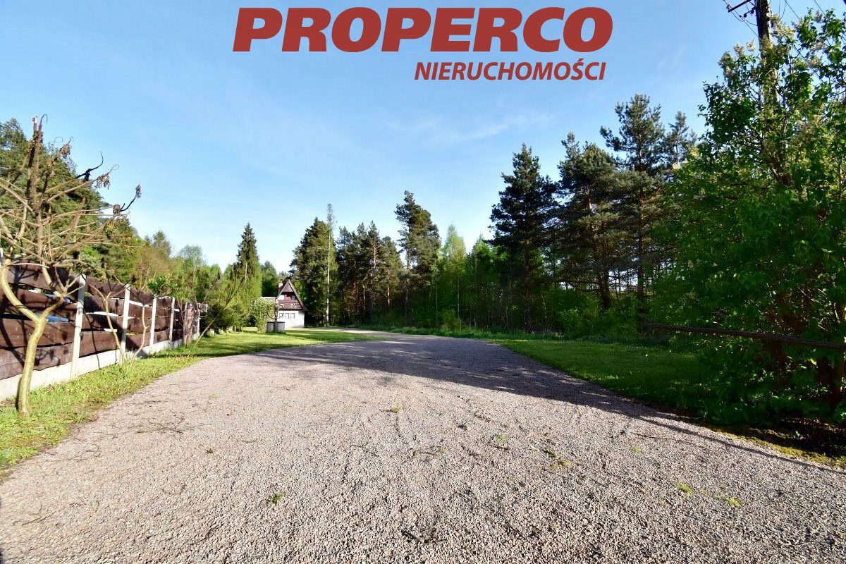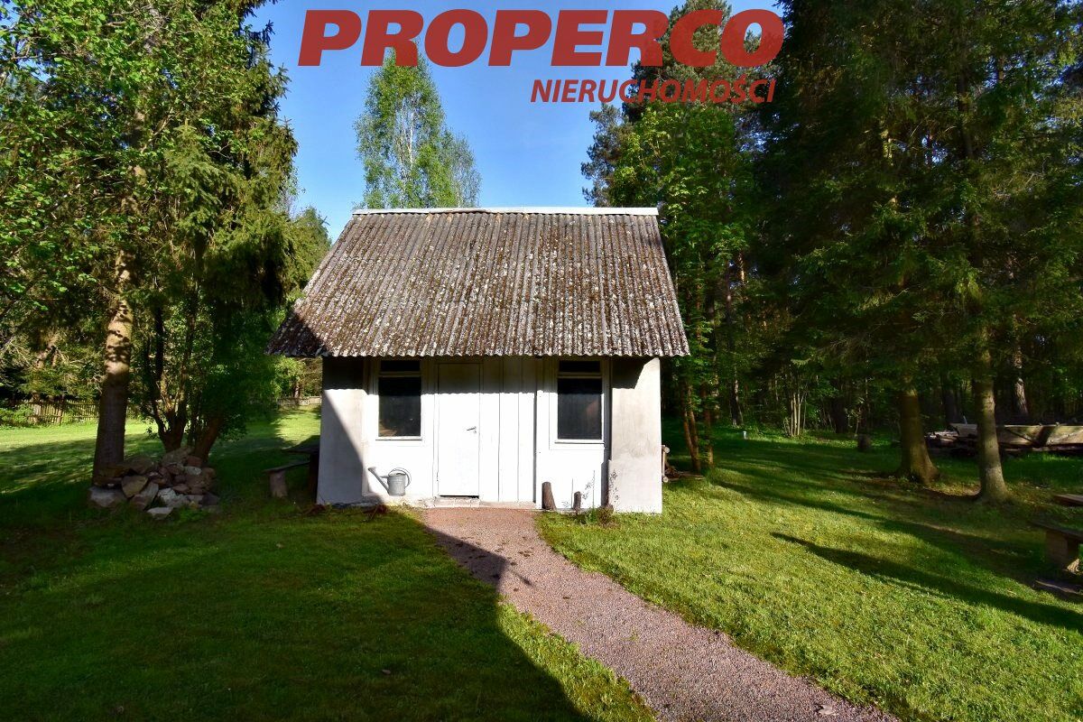 The plot is located in the first line from the road, partially developed, with perennial trees, in the shape of a trapezoid. Access to the plot is via an asphalt road and a dirt road (approx. 300 m). The plot is partially fenced. On the property, there is a summer cottage with an area of approx. 40 m² (comprising a kitchenette and living room on the ground floor; a bedroom and bathroom on the upper floor), an outbuilding of approx. 20 m², and a brick grill.
