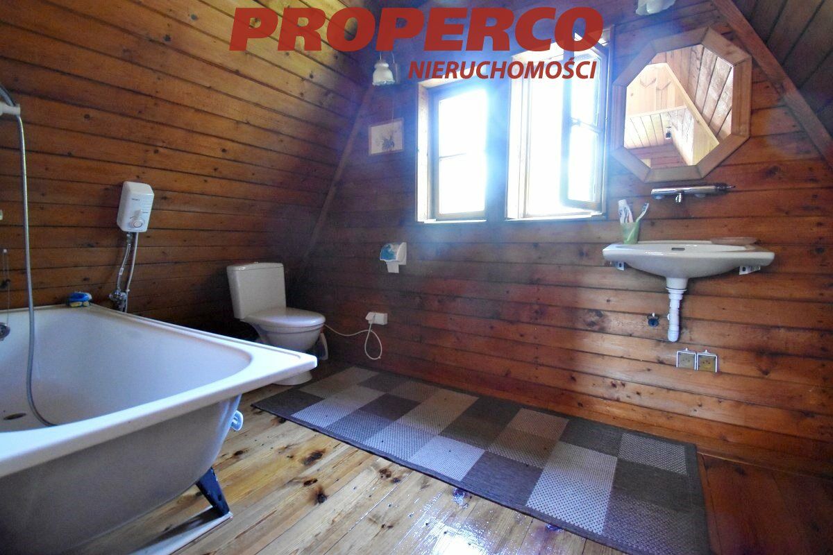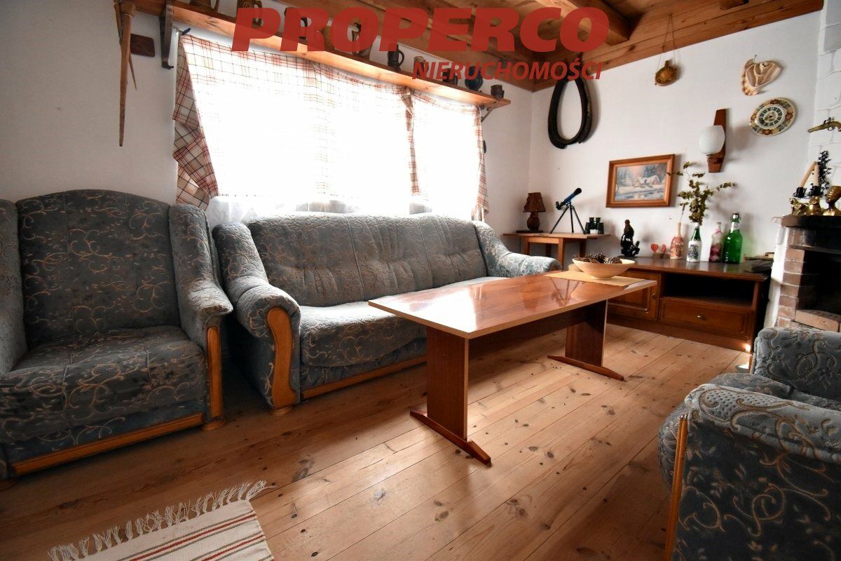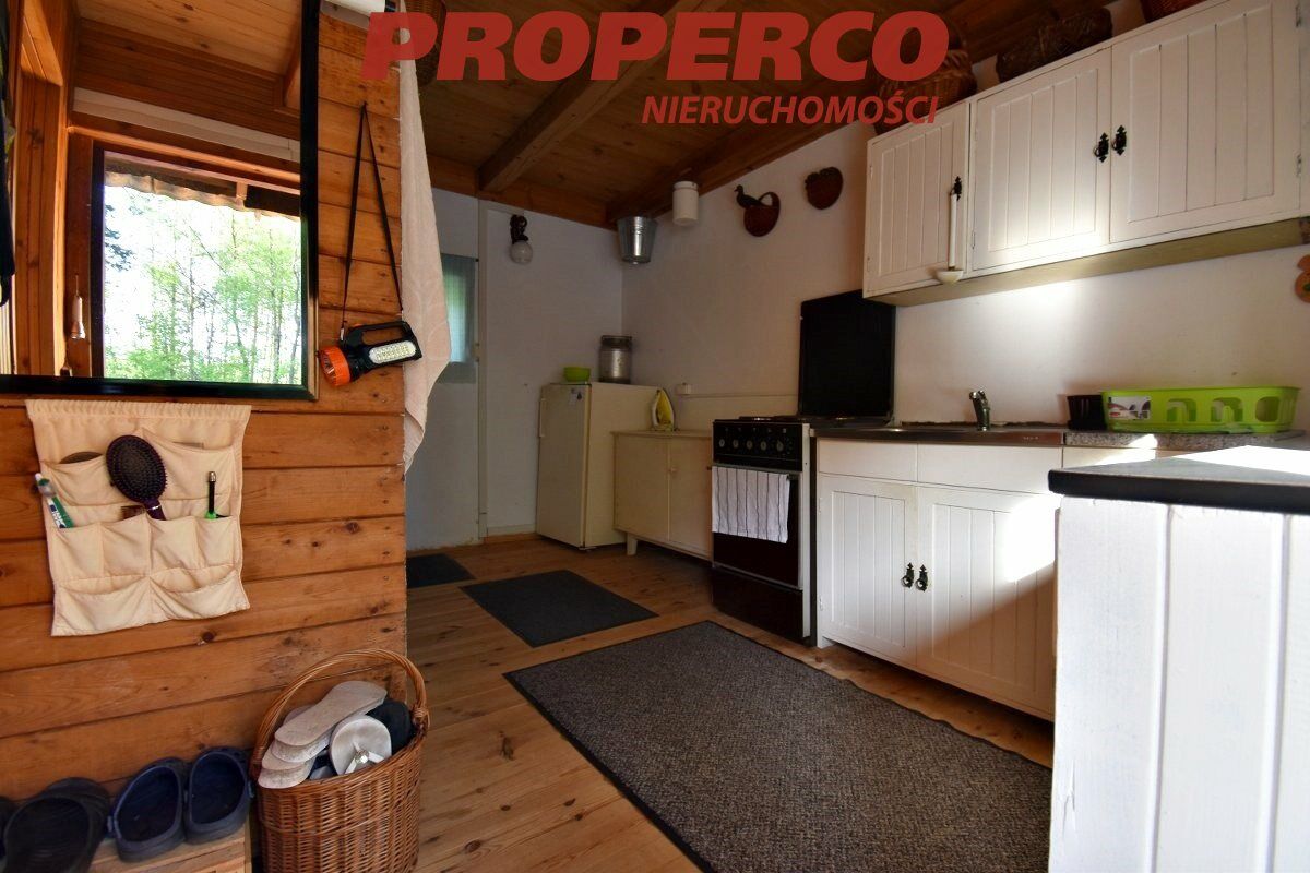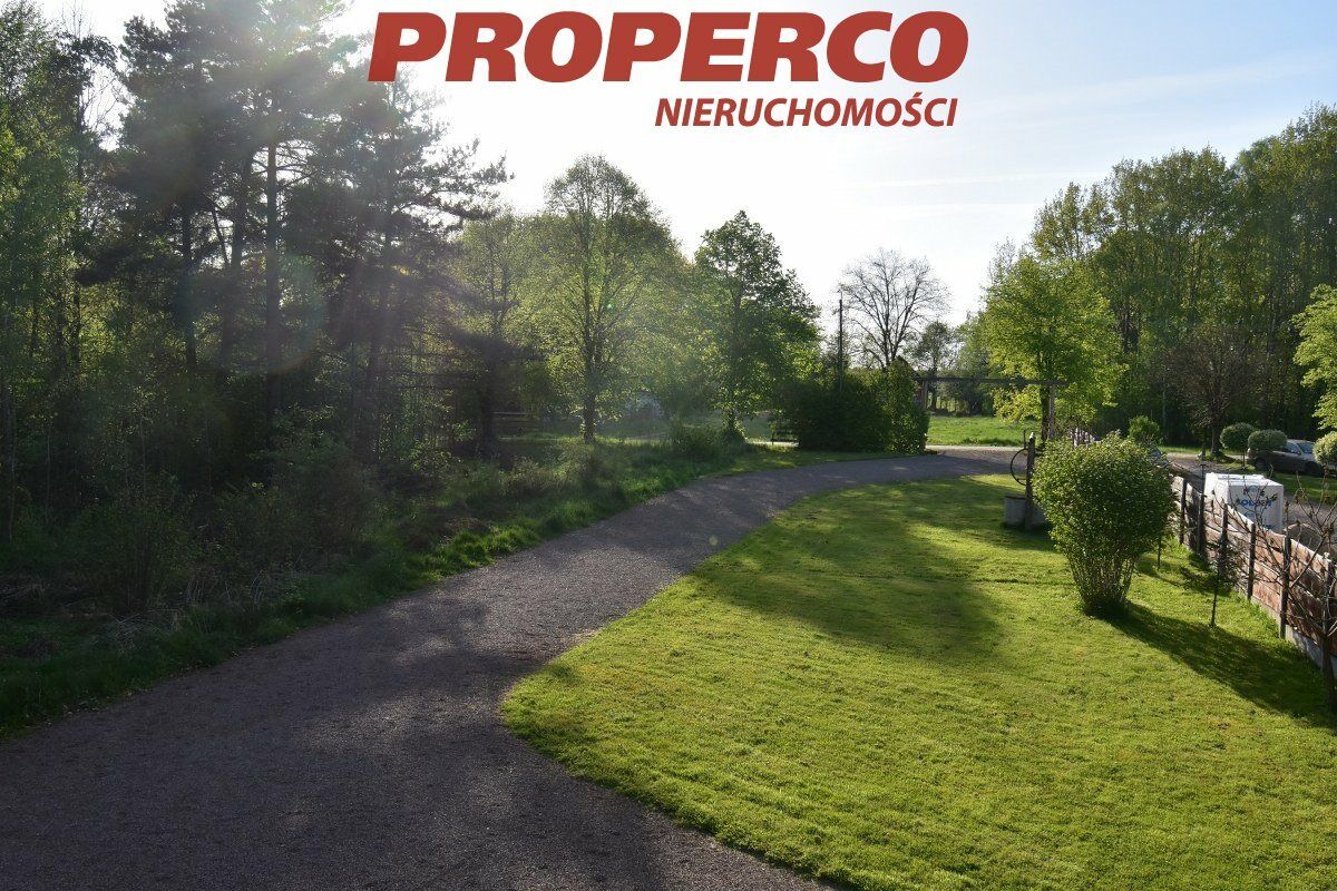 The plot is located in the first line from the road, partially developed, with perennial trees, in the shape of a trapezoid. Access to the plot is via an asphalt road and a dirt road (approx. 300 m). The plot is partially fenced. On the property, there is a summer cottage with an area of approx. 40 m² (comprising a kitchenette and living room on the ground floor; a bedroom and bathroom on the upper floor), an outbuilding of approx. 20 m², and a brick grill.